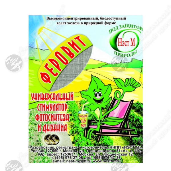 Феровит (универсальный стимулятор фотосинтеза) - высококонцентрированный питательный раствор хелата железа (содержание хелатного железа не менее 75 г/л, азота 40 г/л). Феровитпредназначен для корневых и внекорневых подкормок комнатных, декоративно-цветочных растений, овощных культур и плодово-ягодных деревьев и кустарников. Когда растению не хватает доступного железа, оно начинает страдать хлорозом - нарушается фотосинтез, не образуется хлорофилл, листья начинают желтеть, мельчать, преждевременно опадать. Это приводит к снижению урожайности, декоративности и даже гибели растения. Недостаток железа растения могут испытывать как на щелочных карбонатных почвах, так и на кислых в связи с сильной фиксацией его почвой. При поливе комнатных растений жесткой водой, почва защелачивается и железо становится недоступным для растений. Нормы расхода Некорневые подкормки профилактически проводят 0,03-0,1% раствором Феровита, а при появлении признаков хлороза – 1-2 раза в неделю до полного исчезновения хлороза 0,1-0,4%-ным раствором. Для корневого питания в защищенном грунте рекомендуется от 1 до 3 л препарата Феровита на 1 куб. м маточного раствора. Эта ориентировочная доза применения хелата железа, нуждающаяся в уточнении в зависимости от потребности растений.